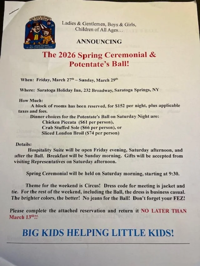 Illustrious Sir Jason Dzembo and First Lady Christine Snyder invite you to join them for the Oriental Shriners 2026 Potentates Ball at the Saratoga Holiday Inn on March 27 - 28. This will be a fun gathering for all of our Shrine Family and for all other Shriners who wish to attend.